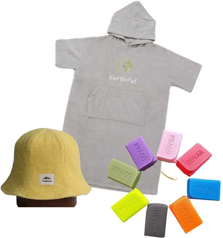 サウナハット(100個〜)、サウナポンチョ(50個〜)、タオル(100個〜)承っております。
